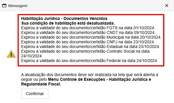 A atualização dos documentos deve ser realizada na tela que será aberta a seguir, ou pelo menu "Controle de Execuções » Habilitação Jurídica e Regularidade Fiscal".