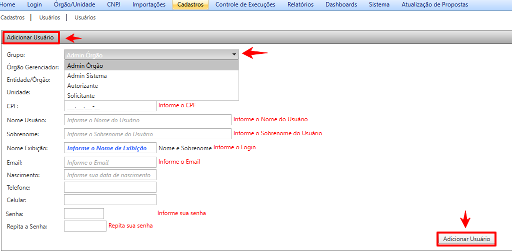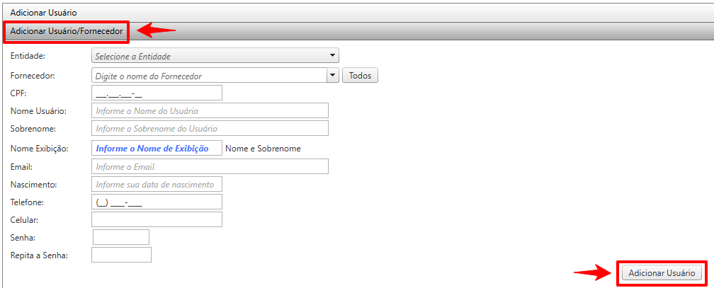 Preencha as informações solicitadas e clique em Adicionar Usuário.