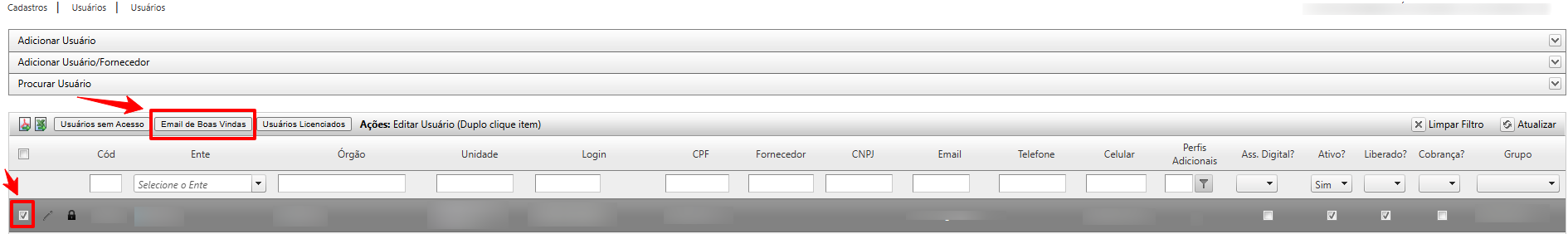 Após criar o usuário você poderá selecioná-lo e enviar "Email de Boas Vindas" para que o mesmo receba login e senha para acessar o sistema.