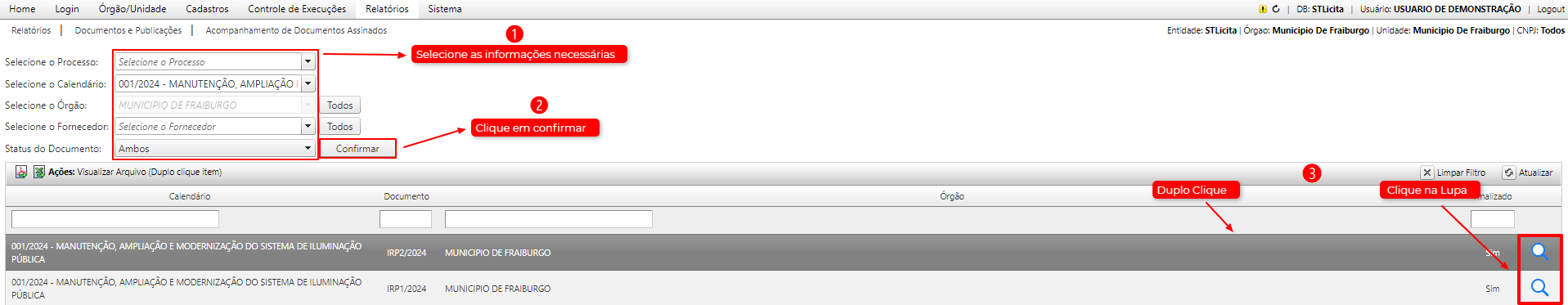 Para acessar o documento, clique no ícone de lupa ou com Duplo Clique na linha desejada.
