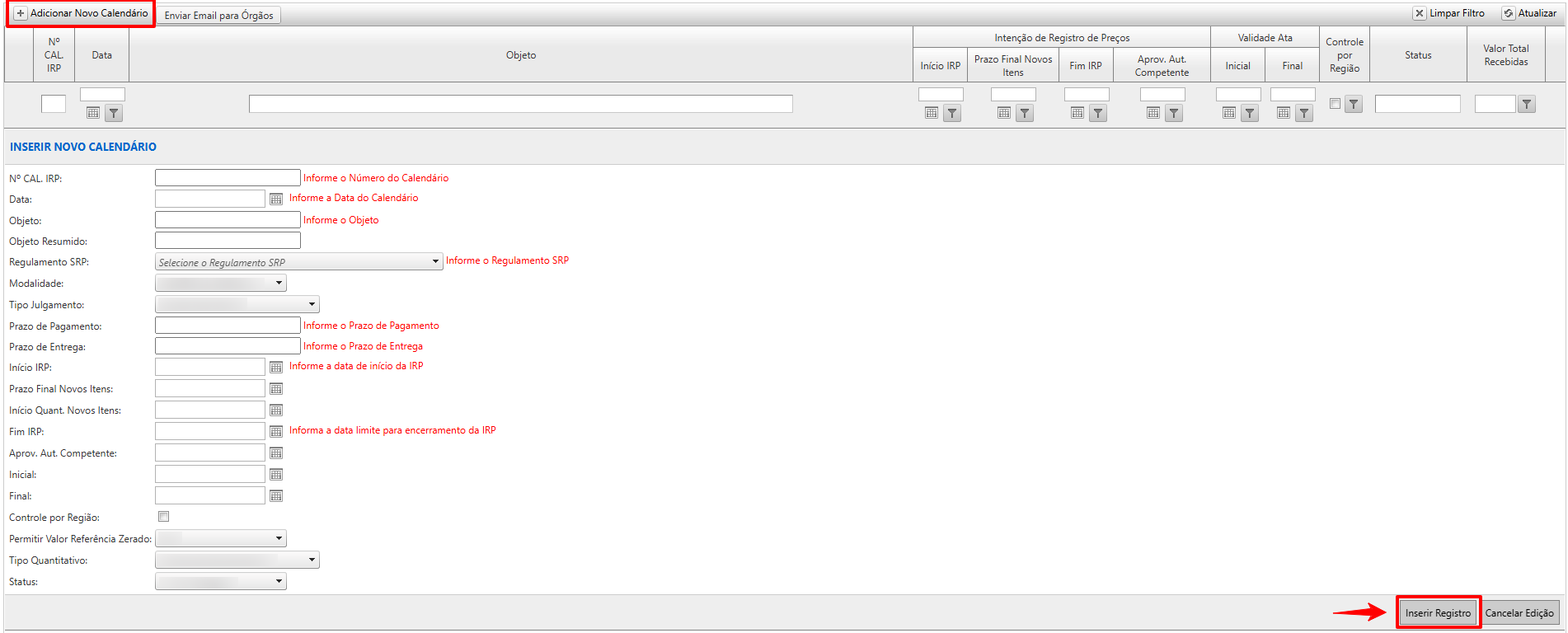 Selecione no menu o item Cadastros » Calendário Intenção de Registro de Preço (IRP).